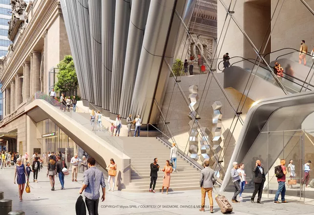 Skidmore, Owings & Merrill is the architect for both the building and the train hall, alongside Beyer Blinder Belle. The train hall will have similar interiors to Grand Central's iconic design.