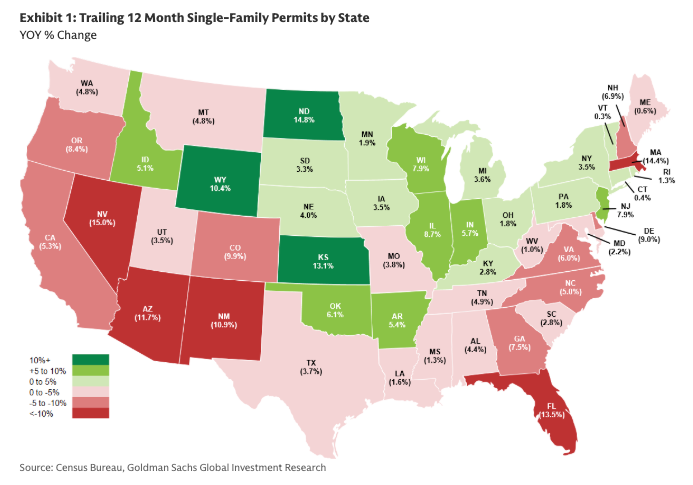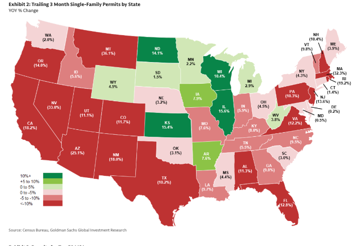 A team of Goldman analysts, led by Susan Maklari, penned a note on Tuesday that provides a heat map for the nation's housing market, showing that falling housing permits signal the real estate market shifted into a lower gear. Builders are more cautious in late year, buyers are waiting for the Fed Chair Powell to unleash another round of interest rate cuts, and home price growth has stalled. The Midwest is holding up, but the South and West markets are softening the fastest.