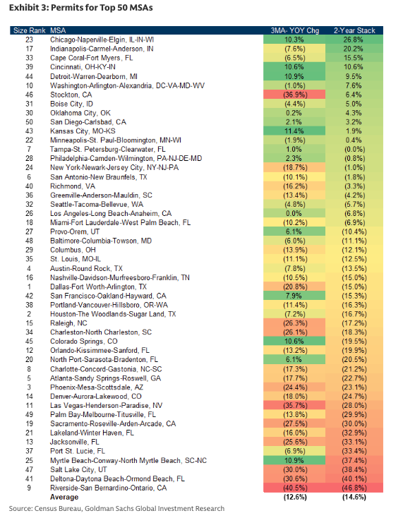 Southern Markets Lead MSA Level Declines Offset by Gains in the Midwest: Permits in the top 50 MSAs declined 13% YOY for the 3 months ended August vs down 11% in July and -2% a year ago. On a YOY basis, Kansas City, MO, Detroit, MI, and Myrtle Beach, SC (+11% each) showed the greatest gains while Riverside, CA (-40%), Stockton, CA (-37%), and Las Vegas, NV (-36%) lagged. On a 2-year stacked basis, growth was led by Chicago, IL (+27%), Indianapolis, IN (+20%), and Cape Coral, FL (+16%). We highlight 4 of the top 10 MSAs are in Midwest, with the South and West largely underperforming, on a 2-year stack basis.