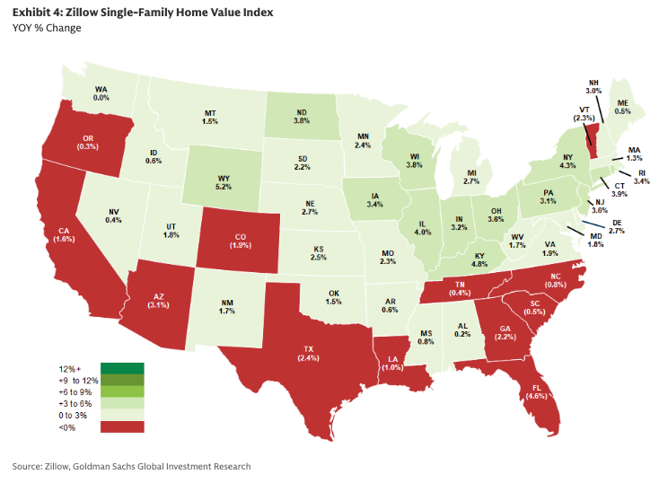 Home Values Flat: Zillow shows national prices flat YoY, with only 1 state seeing >5% gains. Florida (-5%), Arizona (-3%), and California/Colorado/Georgia/Texas (-2% each) declined, while Utah and Virginia rose +2%.